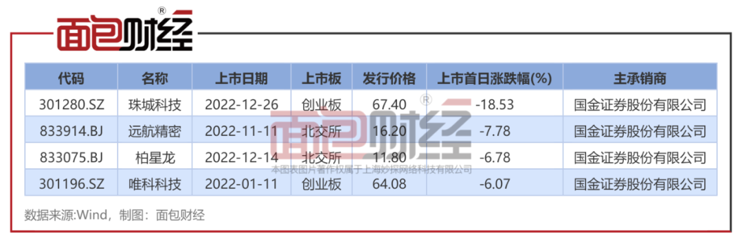 2022年以来,国金证券保荐上市的新股中,4只新股在上市首日破发。珠城科技上市首日破发超18%,远航精密、柏星龙、唯科科技在首日破发超6%。
