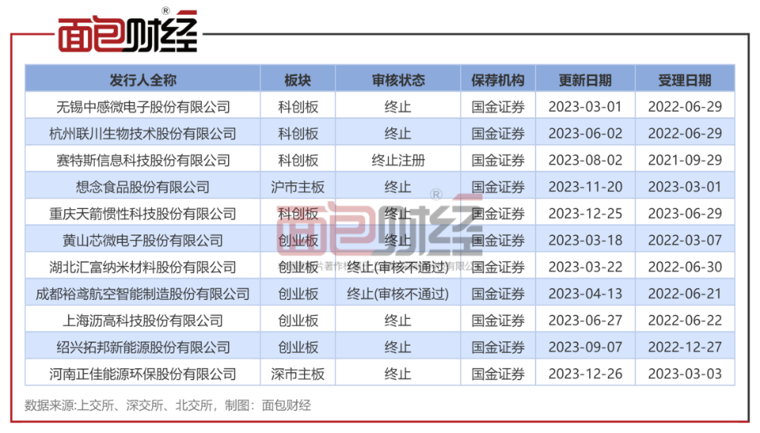 根据交易所披露数据,国金证券在2023年终止的IPO项目达到11个。其中,上交所5个、深交所6个。