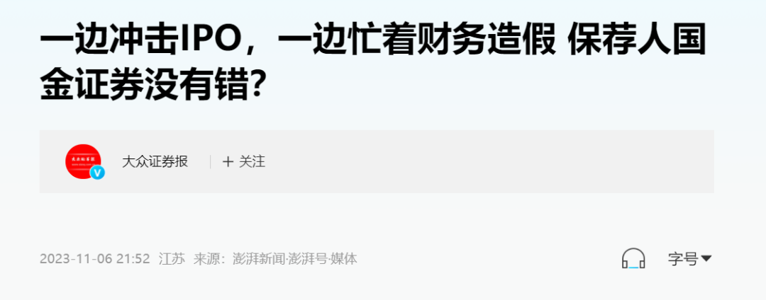 而在2023年,国金证券IPO终止项目达到11个,其中2家被否,9家主动撤回,撤否率达到 17.46%。无独有偶,这些终止IPO项目也存在着大大小小的问题。有项目被质疑“带病闯关”,有项目财务造假陷入舆论漩涡,也反映出执业质量存在的问题。