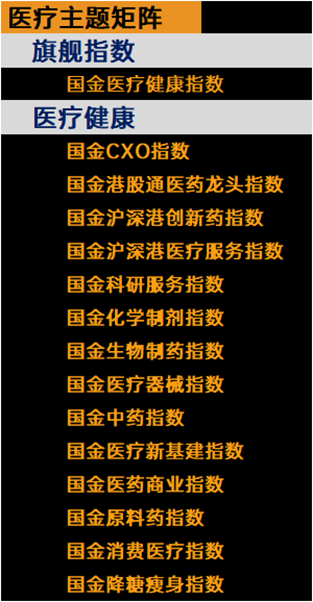国金指数始终对医疗保健相关板块保持密切关注,通过发布医疗保健主题矩阵多维度覆盖医疗保健产业全链条,以期见证未来医疗保健产业的高质量发展。