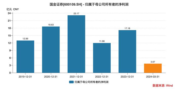 2023年,国金证券营业收入同比增长17.39%至67.29亿元,排名行业第24位;归母净利润同比增长43.41%至17.18亿元,排名行业第23名。然而进入2024年一季度,营收和净利双双下滑,营业收入同比降24.03%至14.83亿元,归母净利润同比降38.6%至3.67亿元。