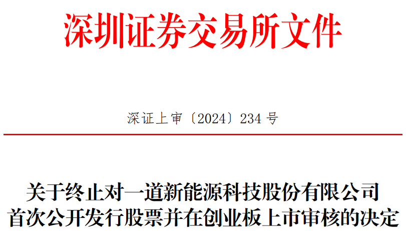 深交所网站8月16日披露关于终止对一道新能源科技股份有限公司(简称“一道新能”)首次公开发行股票并在创业板上市审核的决定。