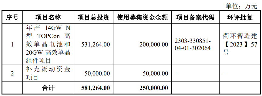 一道新能原拟募集资金250,000.00万元,用于年产14GW N型TOPCon高效单晶电池和20GW高效单晶组件项目、补充流动资金项目。
