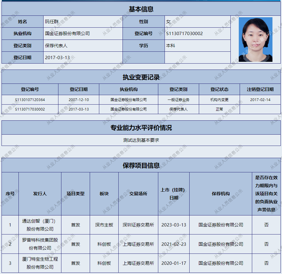 阮任群女士2007年12月在国金证券登记执业,2017年3月担任保代。自2020年以来她相继签署了特宝生物(688278)、罗普特(688619)和通达创智(001368)IPO项目。巧合的是,这三家均是厦门籍上市公司。