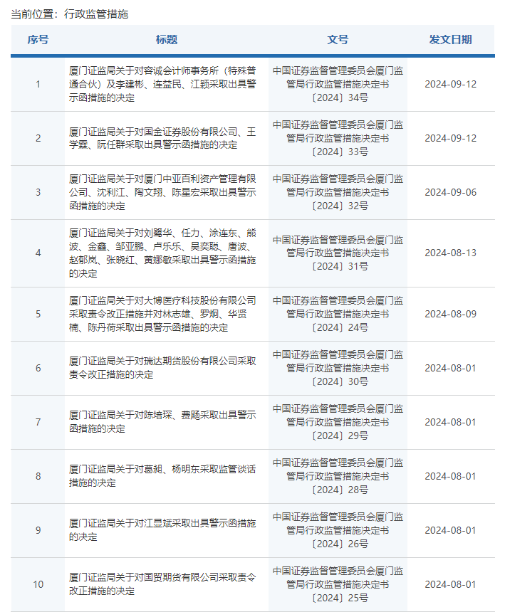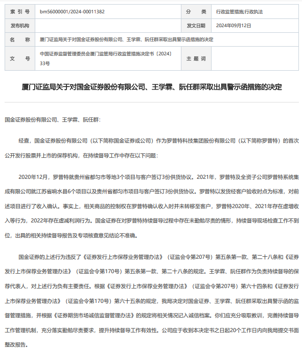 9月10日,厦门证监局对国金证券及负责持续督导的保荐代表人王学霖、阮任群采取出具警示函的监管理施,并根据《证券期货市场诚信监督管理办法》的规定将相关情况记入诚信档案。要求其充分吸取教训,完善持续督导工作管理机制,充分落实勤勉尽责要求,提升持续督导工作有效性。限期20个工作日内提交书面整改报告。