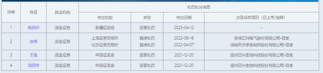 行家注意到,国金证券现有4名C类保代,最近三年受罚5次。本次违规的两位保代尚未收入其中。