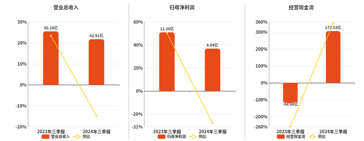 公司营业总收入为42.91亿元,在已披露的同业公司中排名第26,较去年同报告期营业总收入减少7.37亿元,同比较去年同期下降14.66%。归母净利润为8.94亿元,在已披露的同业公司中排名第24,较去年同报告期归母净利润减少3.42亿元,同比较去年同期下降27.70%。经营活动现金净流入为173.53亿元,在已披露的同业公司中排名第19,较去年同报告期经营活动现金净流入增加242.19亿元。