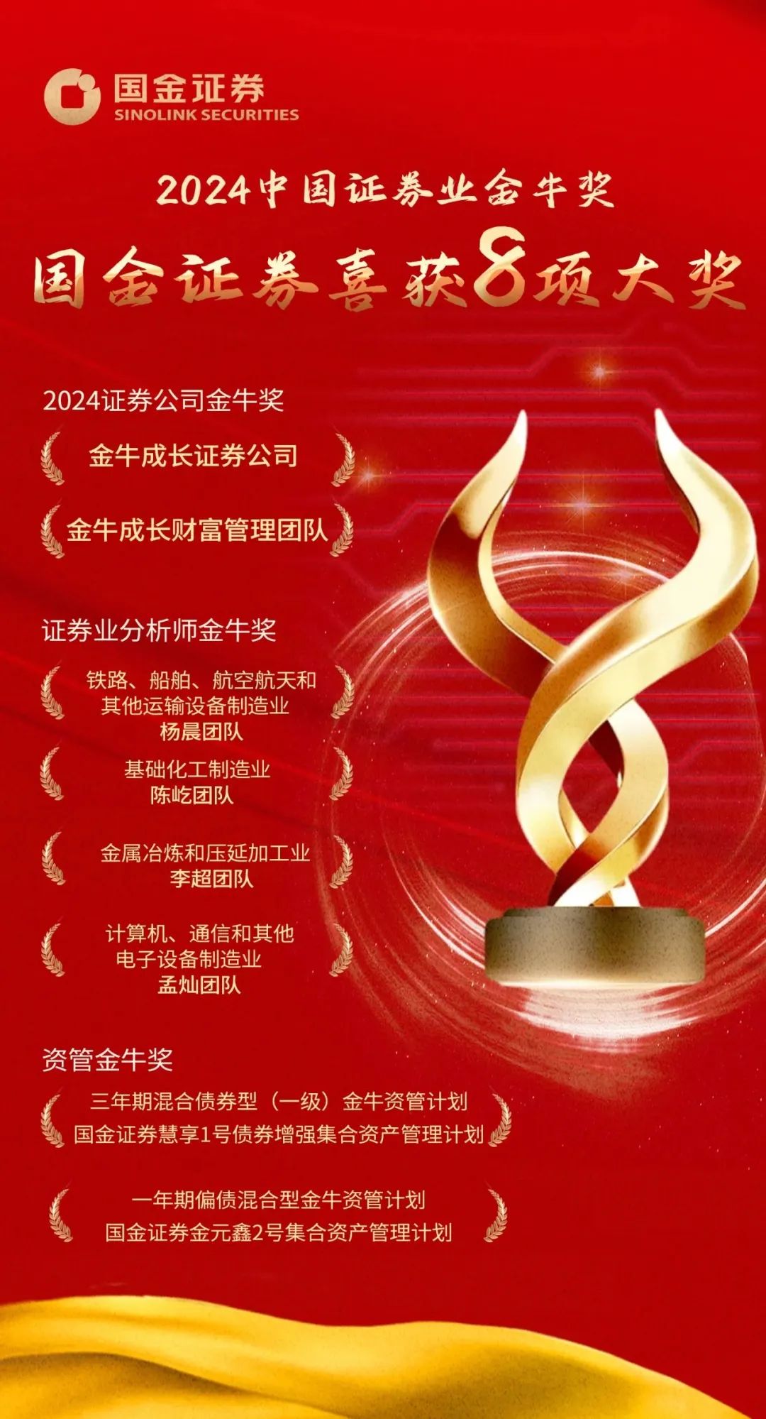 2024年11月22日,由中国证券报主办的“2024证券业高质量发展大会暨金圆集团杯·证券业金牛奖”颁奖典礼隆重举行。会上,2024证券公司金牛奖、第十五届证券业分析师金牛奖等奖项正式揭晓,国金证券凭借卓越的业务表现和综合实力,一举揽获多项大奖。