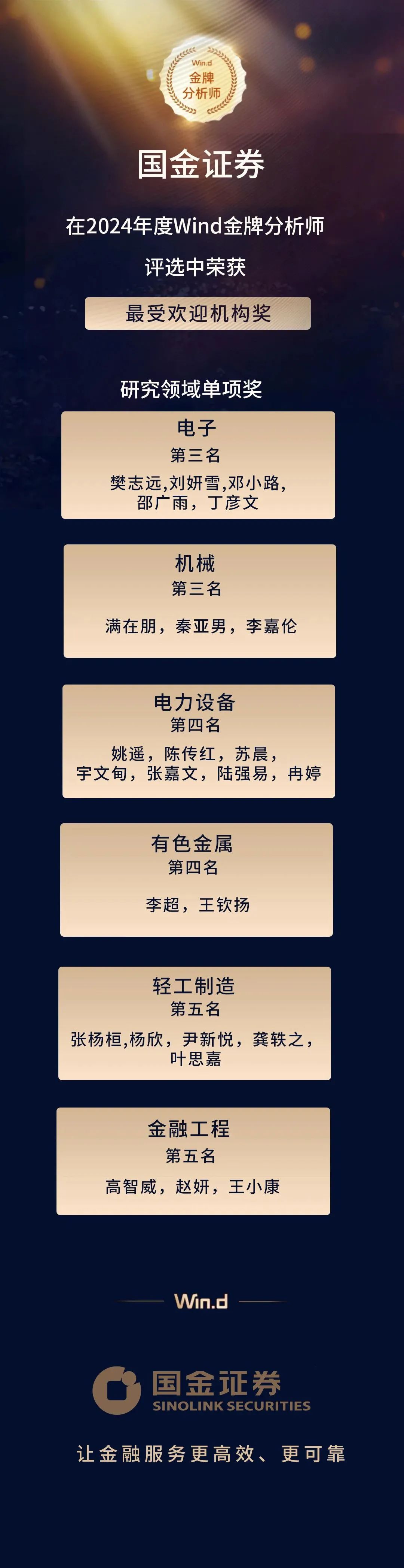 11月21日,2024年第十二届Wind“金牌分析师”评选结果正式揭晓。国金证券荣获“最受欢迎机构”奖;机械满在朋团队、电子樊志远团队获最佳分析师第三名;电新姚遥团队、金属李超团队获最佳分析师第四名;金工高智威团队、轻工张杨桓团队获最佳分析师第五名。