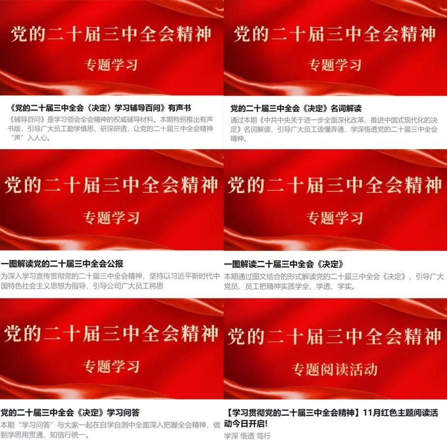 国金证券党委持续加强理论武装,引导广大党员、员工读原著、学原文、悟原理,以学增智、以学铸魂,推动全会精神入脑入心。全会召开后,公司党委为全体党员发放《中国共产党第二十届中央委员会第三次全体会议公报》《中共中央关于进一步全面深化改革推进中国式现代化的决定》《党的二十届三中全会决定学习辅导百问》等学习资料,引导广大党员、员工原汁原味学原文、逐字逐句悟精神,力求将全会精神读懂弄通,学深悟透;同时拓宽学习载体,丰富学习形式,依托“党员之家”线上学习园地,制作推送“有声书”“一图全解”“名词解读”“学习问答”等多期主题学习推文,并以线上职工书屋“悦读坊”为载体,推出“党的二十届三中全会精神”专题阅读活动,营造全员读原著的浓厚氛围,进一步夯实学思之风,把稳思想之舵。