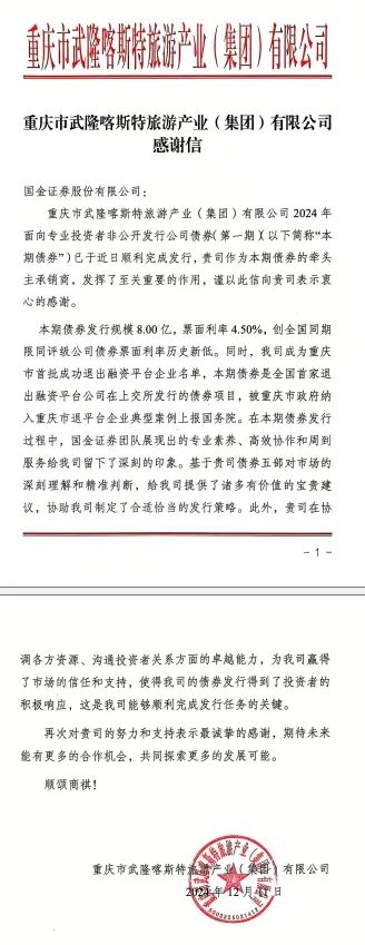 近日,国金证券成功助力重庆市武隆喀斯特旅游产业(集团)有限公司(以下简称“武隆喀斯特旅游集团”)完成2024年面向专业投资者非公开发行公司债券(第一期)的发行工作,并收到了武隆喀斯特旅游集团的感谢信。此次债券的成功发行,为武隆喀斯特旅游集团的持续发展注入了金融“活血”。