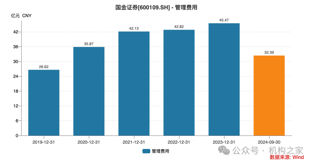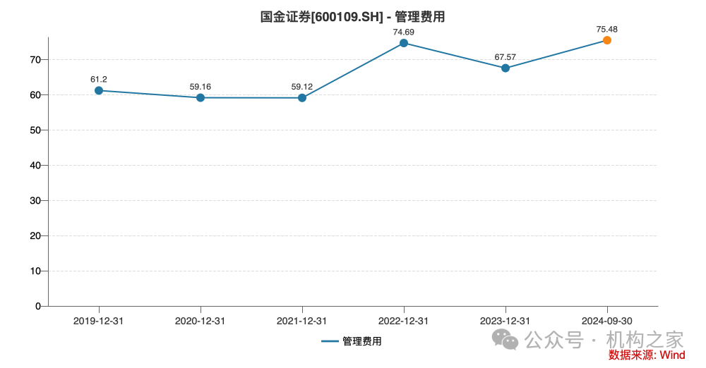 从成本管理的角度审视,国金证券的管理费用呈现持续攀升的态势,其规模从2019年的26.62亿元增长至2023年的45.47亿元,增幅显著。更为关键的是,管理费用占营业收入的比重已从2019年的61.2%攀升至2024年前三季度的75.48%,这一趋势不仅折射出成本控制的压力,也暴露出企业运营效率的潜在挑战。在管理费用的构成中,工资与薪酬无疑是最为关键的支出项,这或是国金证券积极谋求薪酬改革的重要背景之一。通过优化薪酬体系,公司或将致力于提升人力资源配置效率,并在控制成本与激励人才之间寻求更优平衡。