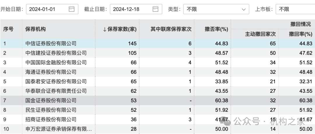 尤为值得关注的还有其保荐业务数据。2024年年初至今,国金证券共保荐53个项目,却主动撤回了32个项目,撤否率高达60.38%。这一比例在保荐家数位居前十的券商中位列第一。如此之高的撤否率暴露出国金证券在项目筛选与风险把控方面的薄弱。