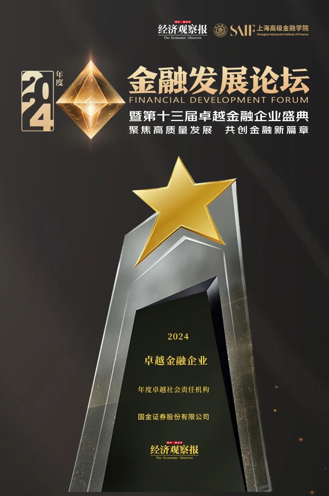 近日,由《经济观察报》主办的“2024年度金融发展论坛暨第十三届卓越金融企业盛典”在上海圆满落幕。国金证券凭借社会责任方面的积极贡献,荣获“年度卓越社会责任机构”奖项,国金资管权益投资团队也凭借出色的投资业绩,荣获“年度卓越资管权益投资团队”奖。