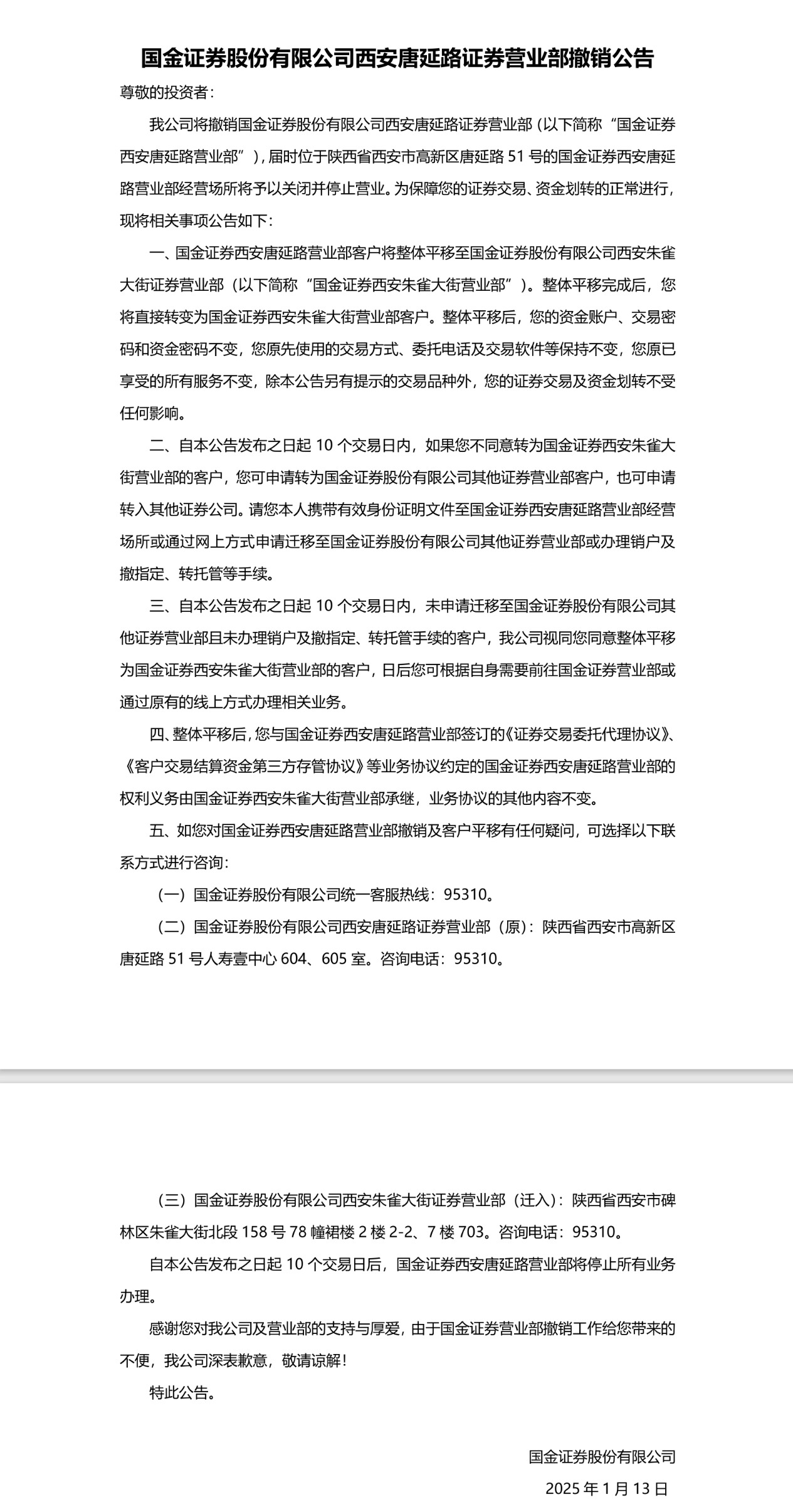 国金证券(600109)1月13日公告,公司将撤销西安唐延路证券营业部。详见公告: