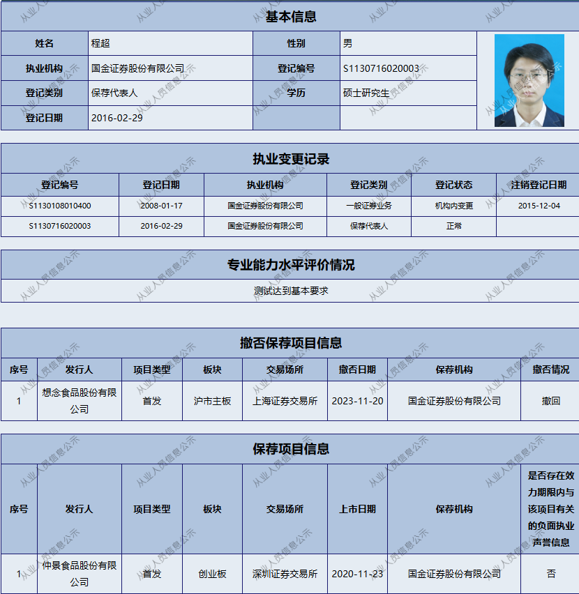 对照保代列表,程超于2008年1月登记执业于国金证券,2016年2月取得保代资质。曾经在2020年与宋乐真共同签署仲景食品IPO项目,却在思念食品撤单一年多之后被罚。