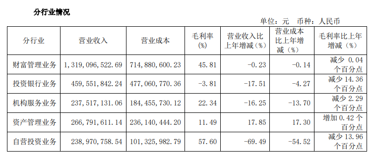 然而,主营业务分部数据显示,仅有投行条线“入不敷出”:毛利率为-3.81%,同比减少14.36 个百分点。