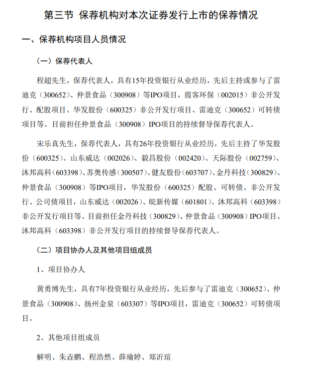 发布于2023年初的IPO文件显示,两名保代的投行从业年限分别为15年和26年。就连项目协办人,当时也有7年投行从业经历。而且这些资深保代,曾经主持和参与并且获得成功项目,足足写了好几行。