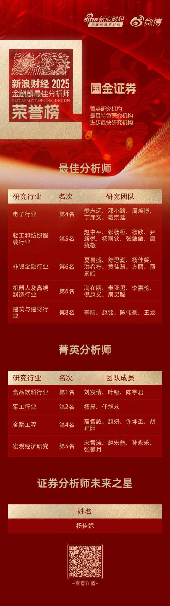 11月28日,第七届新浪财经金麒麟最佳分析师评选结果揭晓, 国金证券 研究团队荣获“最具特色研究机构”第六名、“进步最快研究机构”第五名、”菁英研究机构“第二名。