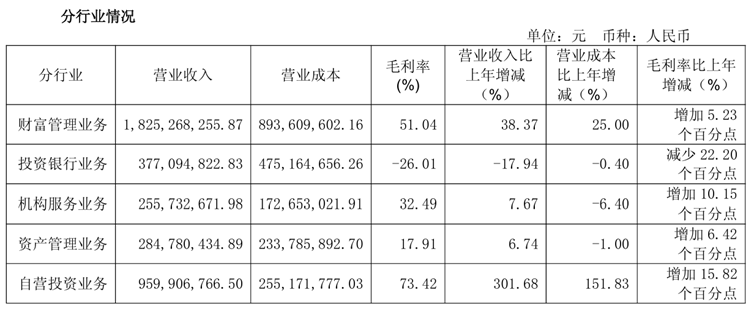 国金证券 业绩快速增长,更大的推动力来源于自营业务。今年上半年,财富管理业务收入为18.25亿元,同比增长38.37%;自营业务收入为9.60亿元,同比增长301.68%。