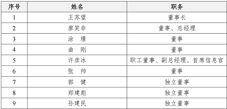 简历显示,王望苏曾任 中信证券投资 银行部职员, 招商证券投资 银行总部战略客户部总经理、投资银行总部副总经理。廖笑非曾任 国投证券 投资银行业务委员会主任兼股权融资总部总经理。