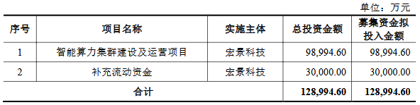3月30日,宏景科技披露《募集说明书(修订稿)(豁免版)》。本次募集资金总额不超过128,994.60万元(含本数),扣除发行费用后募集资金净额拟全部用于智能算力集群建设及运营项目、补充流动资金。