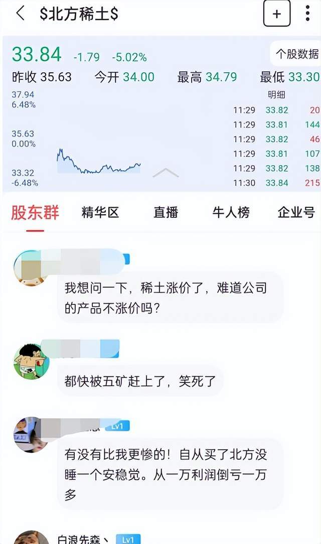 在尺度北方稀土股东群,有投资表示,“这是稀土龙头吗?跌起来六亲不认,三天已跌了差不多十元了,亏好几万。”还有投资者表示,“有没有比我更惨的,自从买了北方稀土,没睡一个安稳觉,从赚一万到亏一万。”