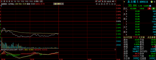 6月23日,北方稀土低开低走,盘中一度跌超6%,截至午间休市,北方稀土跌5.02%,最新股价为33.84元/股,最新总市值为1229亿元。