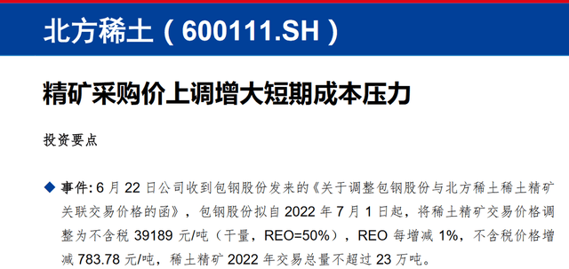 6月22日晚间,北方稀土公告称,公司收到了关联公司包钢股份的《关于调整包钢股份与北方稀土稀土精矿关联交易价格的函》,拟2022年7月1日起,将稀土精矿交易价格调整为不含税39189元/吨。