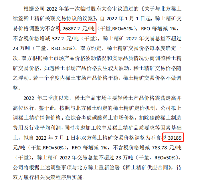 上次调价发生在今年1月份续签合同时。今年1月8日,包钢股份发布与北方稀土续签稀土精矿关联交易协议的公告显示,双方续签《稀土精矿供应合同》,拟自2022年1月1日起,双方稀土精矿销售价格调整为不含税26887.20 元/吨(干量,REO=51%),REO每增减1%,不含税价格增减527.2元/吨(干量),稀土精矿2022年交易总量不超过23万吨。