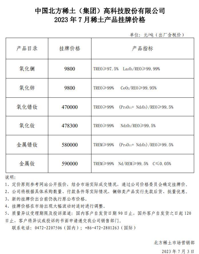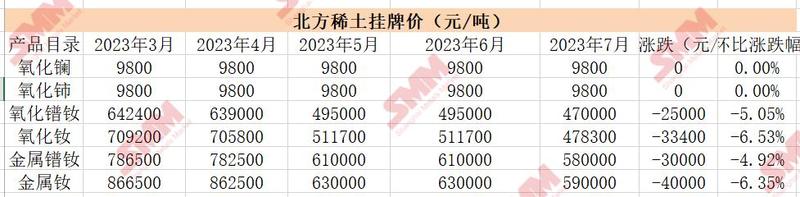 SMM7月1日讯:7月1日,北方稀土发布2023年7月稀土产品挂牌价格,多稀土产品价格出现下调。氧化镧及氧化铈报9800元/吨,较2023年6月持平。氧化镨钕报495000元/吨,较6月下跌25000元/吨,环比跌幅5.05%;氧化钕报478300元/吨,较6月下跌33400元/吨,环比跌幅6.53%;金属镨钕报580000元/吨,较6月下跌30000元/吨,环比跌幅4.92%;金属钕报590000元/吨,较6月下跌40000元/吨,环比跌幅6.35%。