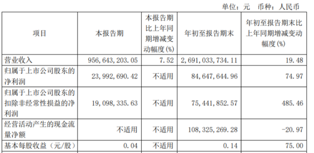 10月26日,东睦股份发布2021年三季报,该公司前三季度营业收入为26.91亿元,同比增长19.48%。归属于上市公司股东的净利润为8464.76万元,同比增长74.97%。归属于上市公司股东的扣除非经常性损益的净利润为7544.19万元,同比增长485.46%,基本每股收益为0.14元。