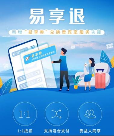 “易享券”可在东航和上海航空实际承运的国内航班上,按照金额,不受限制地兑换机票,或者抵用于升舱、增加行李额等。现如今中国东方航空对“易享退”产品进行升级,在中国东航APP上线“易享券”支持兑换贵宾室服务功能,中国东航所有线上销售的贵宾休息室均可使用。据悉未来中国东航也将不断拓展“易享券”支持兑换的产品范围,为您提供更优质的服务。