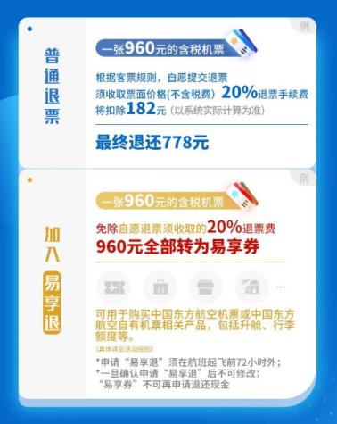“易享退”发布于东航的APP、官网等官方渠道,面向东航和上海航空实际承运的国内航班旅客。旅客购票(不含积分兑换机票)之后,如果临时行程有变化,原机票购买人成功参与“易享退”后,在东航APP或者官网退票,该次退票减免机票退票手续费,机票款将全额(机票+税费)以“易享券”的形式返还至其会员名下卡券内,客户收到后即可使用。