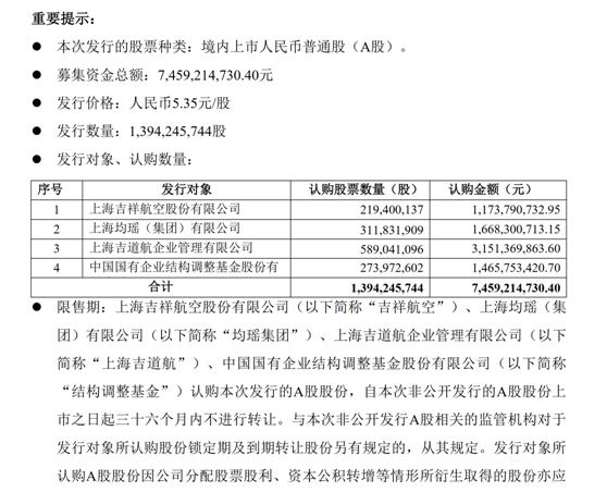 同年,吉祥航空、均瑶集团和上海吉道航企业管理有限公司(吉祥航空子公司,以下简称上海吉道)参与了中国东航定增,三家公司分别认购了中国东航约2.19亿股、3.12亿股和5.89亿股的非公开发行A股股份,耗资合计约59.93亿元。