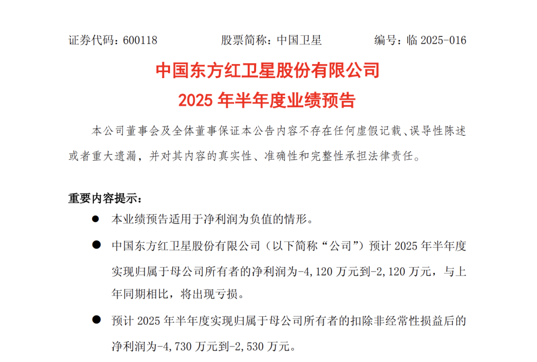 运营商情报讯(记者张鑫)当“中国卫星”的亏损预告出现在投资者眼前,这盏资本市场中的航天信号灯,首次亮起了警示红光。作为中国航天科技集团旗下的核心上市公司,中国卫星2025年中期预亏4120万元至2120万元的消息,在资本市场激起波澜。