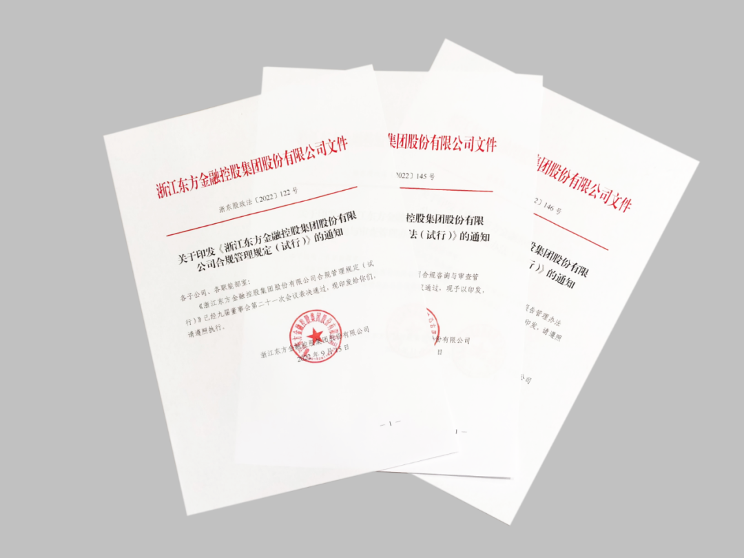 作为省国贸集团下属国有上市金控平台,浙江东方历来高度重视企业法治、合规管理体系建设,2022年6月,公司被浙江省国资委确定为参与合规管理示范创建的省属企业重要子企业之一。近年来,公司坚持以习近平法治思想为指引,认真贯彻省国资委、省国贸集团各项工作部署要求,紧紧围绕“十四五”战略规划,结合金控平台实际,围绕“五个突出”,从突出顶层设计、健全组织体系、完善制度体系、梳理指引体系、强化运行机制等多个维度,全面推进合规管理体系建设,为公司高质量发展保驾护航,初具成效。
