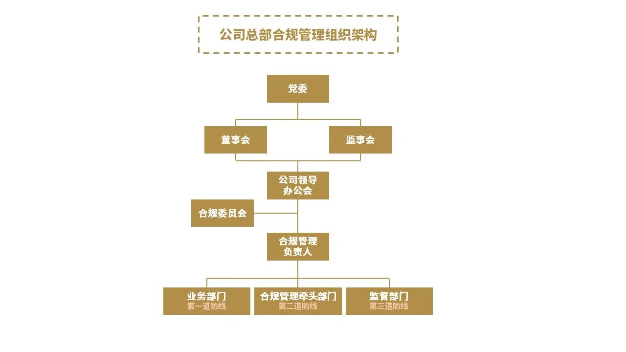 公司总部在现有治理架构的基础上,通过合规制度进一步明确了党委、董事会、监事会、领导办公会等机构的合规管理职责。公司总部设置合规委员会,负责组织指导、统筹协调公司合规管理工作,设置合规管理负责人,负责领导合规管理牵头部门开展工作。同时,进一步明确各职能部室、子公司、合规管理员的合规管理职责,结合金控平台业务实际,自上而下建立起公司总部统筹协调,各所属子公司各负其责的统一领导、分工负责、左右协同、上下联动、有效运转的合规管理组织体系。