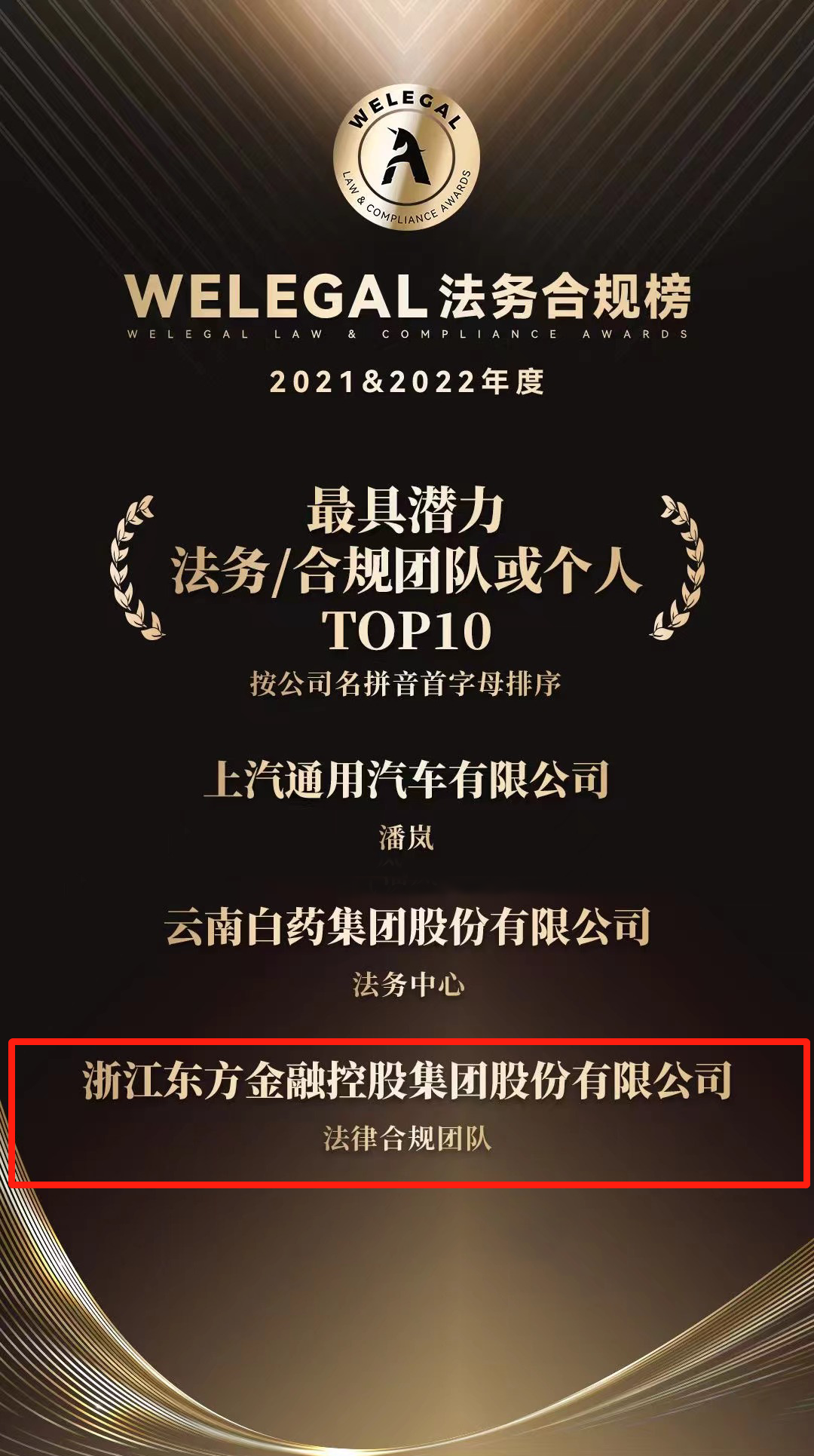 近期,WeLegal法盟正式发布“2021 2022年度法务合规榜”,浙江东方法律合规团队在激烈竞争中脱颖而出,荣获“2021 2022年度最具潜力法务/合规团队或个人TOP 10”。