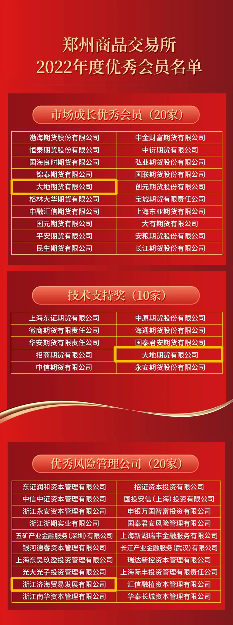 近日,郑州商品交易所发布《关于公表彰2022年度优秀会员的决定》,浙江东方旗下大地期货荣获“市场成长优秀会员”称号和“技术支持奖”,子公司浙江济海荣获“优秀风险管理公司”称号。此次评选旨在表彰2022年度中在市场发展、产业服务、机构服务、创新业务、对外开放、人才培育、客户管理、技术支持、品种培育等方面突出的会员。