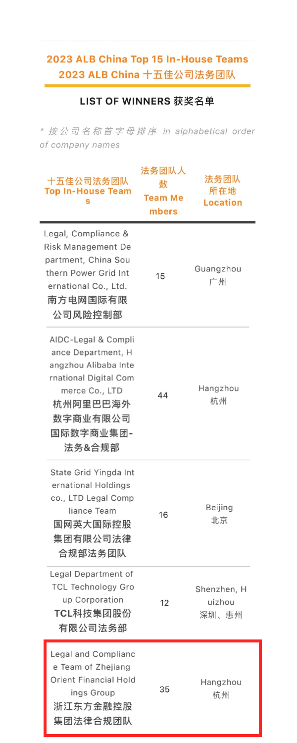 近期,汤森路透(Thomson Reuters)旗下《亚洲法律杂志》(ALB)正式发布“2023 ALB China 十五佳公司法务团队”榜单,浙江东方金融控股集团法律合规团队在激烈竞争中脱颖而出荣获该奖项。该评选历时近两个月,依据工作的复杂程度、创新思维和卓越表现等标准进行评选,最终上榜的公司还包括南方电网、阿里巴巴、国网英大、TCL等。