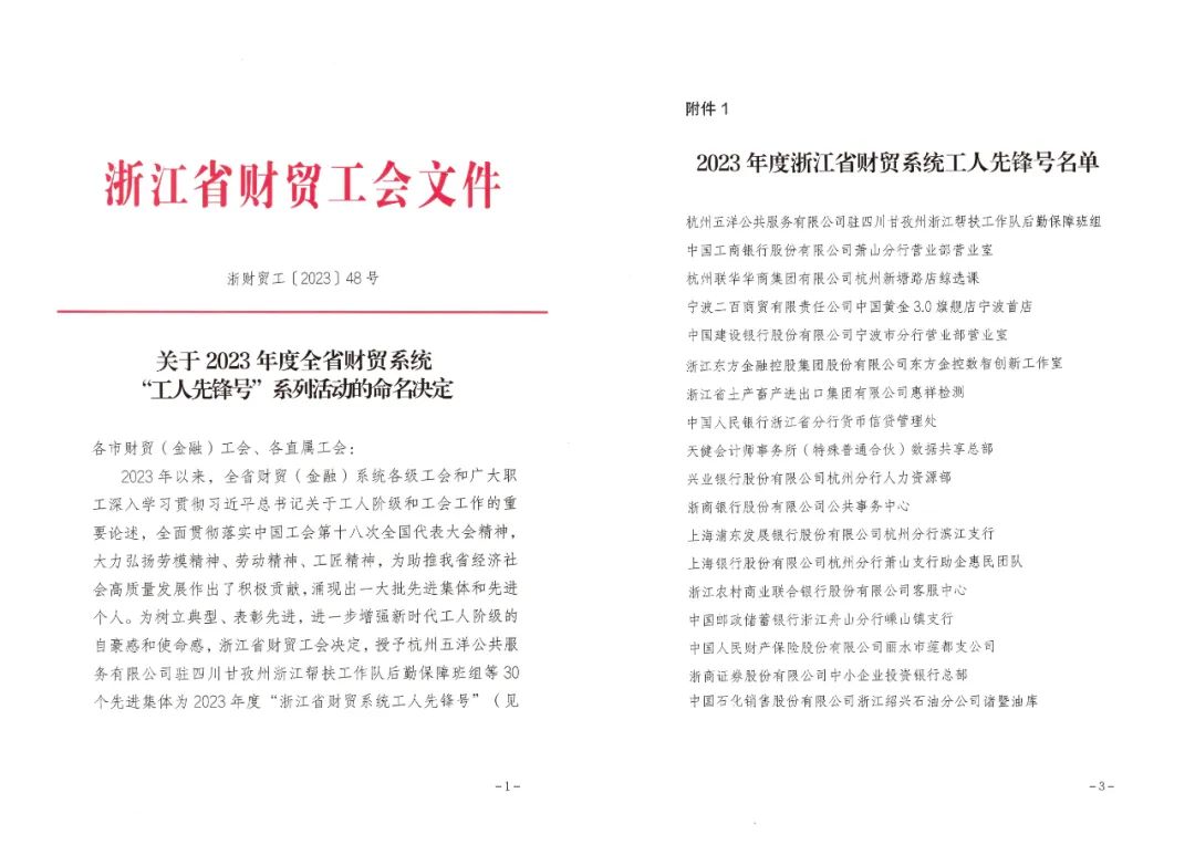 为树立典型、表彰先进,大力弘扬劳模精神、劳动精神、工匠精神,近日中国财贸工会浙江省委员会发文公布2023年度浙江省财贸系统工人先锋号名单,浙江东方金控数智创新工作室获评浙江省财贸系统“工人先锋号”荣誉称号。