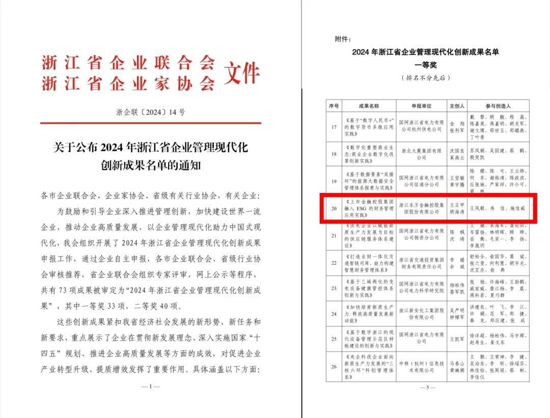 近日,浙江省企业联合会和浙江省企业家协会公布2024年浙江省企业管理现代化创新成果名单,浙江东方申报的“上市金融控股集团融入ESG的财务管理应用实践”荣获一等奖,继获评2024年浙江省企业管理现代化创新成果(财务领域)后的又一突破。该项创新成果从财务管理视角,探索ESG、可持续信息披露等新要素的有效融合,彰显了公司在建设一流财务管理体系上的创新引领,为全省企业管理创新树立了示范引领的标杆。