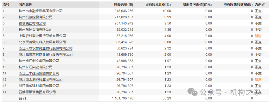 杭州联合银行股权分散。截止2023年底,最大机构股东为杭州市金融投资集团,持股10.0%;其次为杭州杭氧控股,持股9.99%;福信集团为第三大股东,持股9.5%。剩余股东持股均不超过5%。杭州联合银行还吸引了不少同业来“捧场”,例如去年新增股东上海农商行,持股4.0%,另外还有禾城农商行、临海农商行,持股分别为2.32%和2.00%。除此之外,根据有关数据,杭州联合银行股东中非职工自然人股东合计持有24.99%,职工自然人股东持股10.95%。