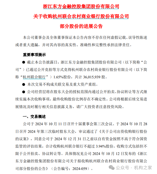 浙江东方于10月11日召开董事会会议以及10月28日召开临时股东大会,审议通过《关于公司出资收购银行股份的议案》。根据议案内容,浙江东方计划在今年12月31日前,以自有资金收购杭州联合银行不超过3.94%的股份。目前,浙江东方已完成了部分收购,取得了杭州联合银行1.65%的股份。公司表示,将继续通过公开拍卖、协议转让等方式推进剩余股份的收购工作。
