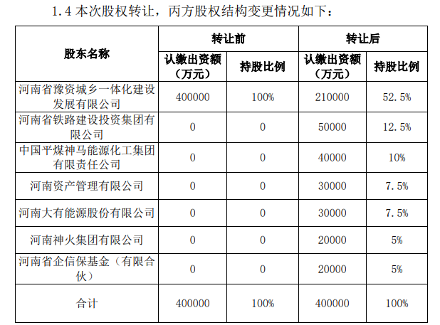 除了大有能源外,河南省铁路建设投资集团有限公司、河南资产管理有限公司、中国平煤神马能源化工集团有限责任公司、河南神火集团有限公司以及河南省企信保基金(有限合伙)也将受让中豫信增部分股权。交易完成后,豫资一体化对中豫信增的认缴出资额为21亿元,出资比例为52.5%;大有能源认缴出资额为3亿元,出资比例为7.5%。