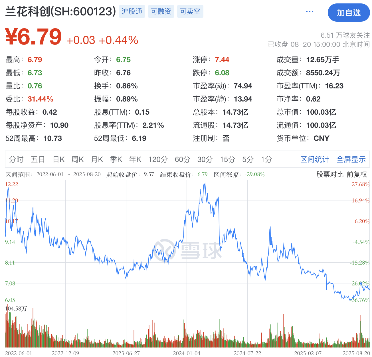 刘海山,1969年7月出生,拥有大学学历,自2022年6月起担任兰花科创董事长,2024年2月起兼任公司总经理。在其任职期间,尽管公司股价累计下跌近三成,但二级市场上,截至20日收盘,兰花科创股价微涨0.44%,报6.79元/股,总市值达到100.03亿元。