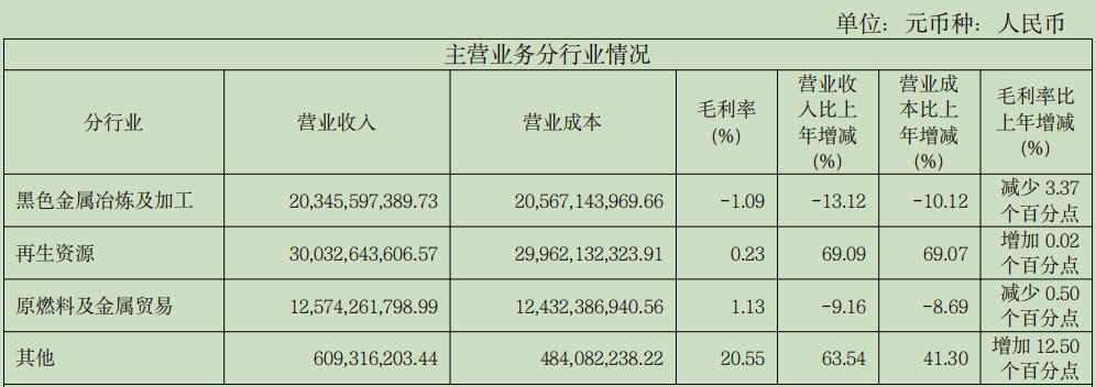 根据年报披露,杭钢股份目前的主营业务分为黑色金属冶炼及加工、再生资源、原燃料及金属贸易以及其他。其中原燃料指铁矿石、煤、焦等大宗;再生资源指包括废钢、有色废旧金属等废旧金属的加工和销售,如2024 年已回收报废汽车 27000 辆,同比增长 170%。