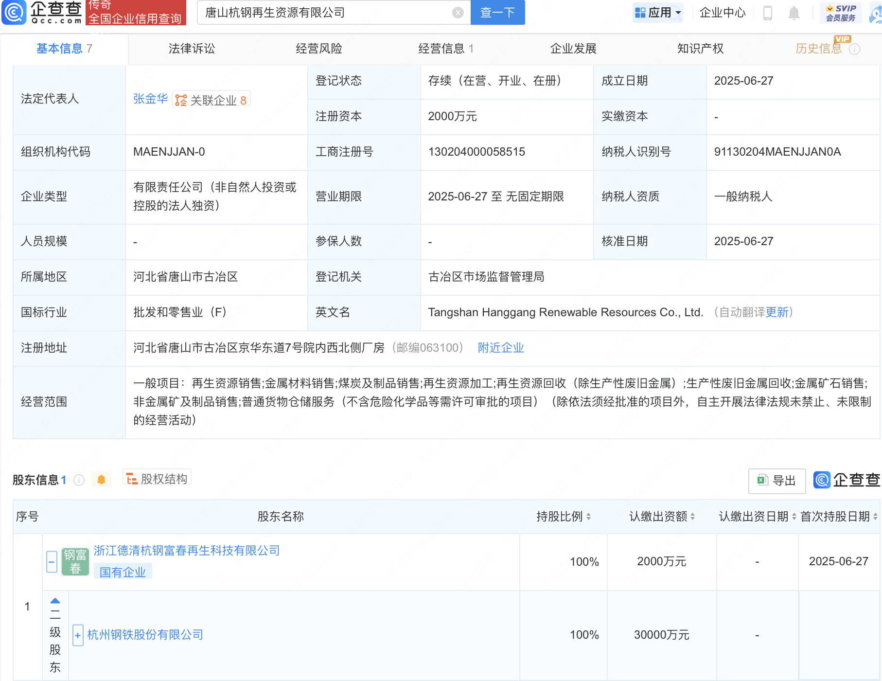 近日,唐山杭钢再生资源有限公司成立,注册资本2000万元,经营范围包含:再生资源销售;金属材料销售;煤炭及制品销售;再生资源加工等。股权穿透显示,该公司由杭钢股份(600126)间接全资持股。