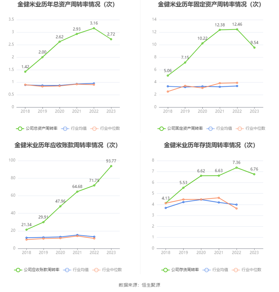 营运能力方面,2023年,公司公司总资产周转率为2.72次,上年同期为3.16次(2022年行业平均值为0.95次,公司位居同行业1/25);固定资产周转率为9.54次,上年同期为12.46次(2022年行业平均值为3.39次,公司位居同行业1/25);公司应收账款周转率、存货周转率分别为93.77次、6.76次。